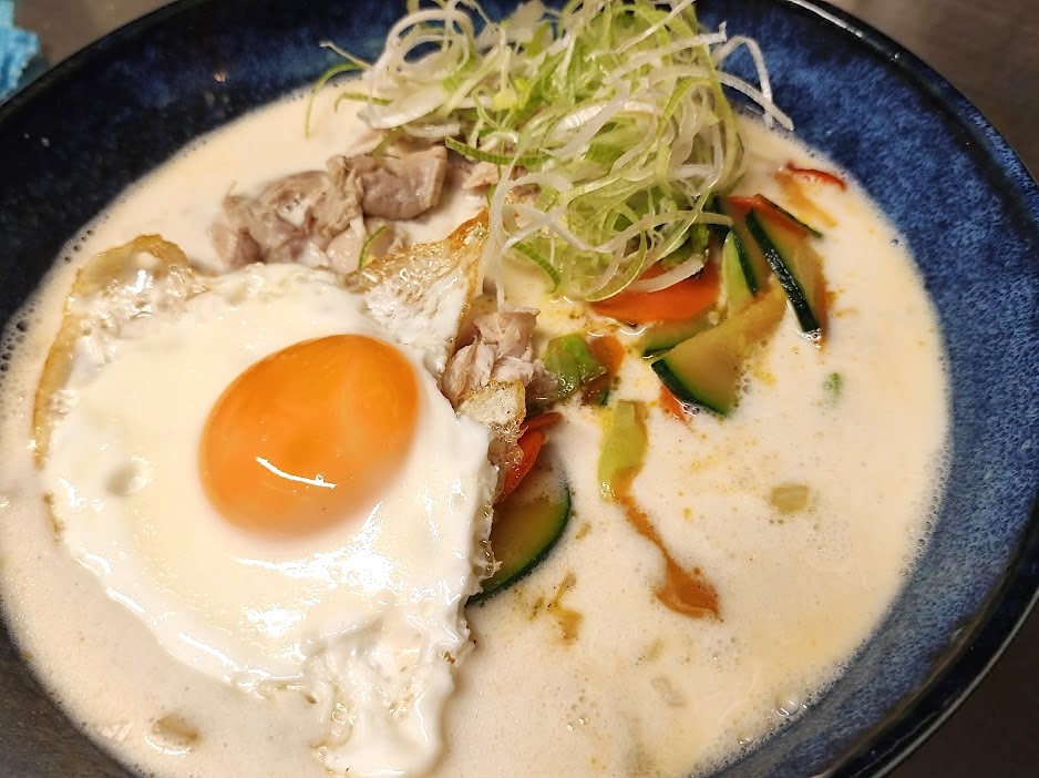 Nouilles servies avec notre bouillon de poulet avec une base au curry japonais, garni de légumes BIO et poulet (ou végétarien / végan)