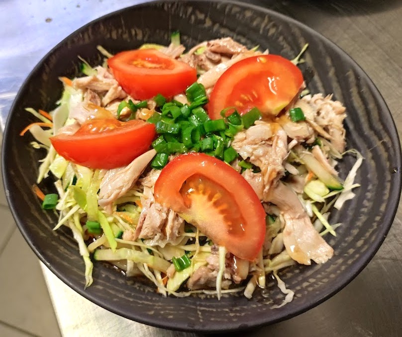 Nouilles maison accompagnées de légumes croquants et de poulet, avec une sauce japonaise (soy sauce, vinaigre japonais, huile de sésame). Servi frais. (option végétarien / végan possible)